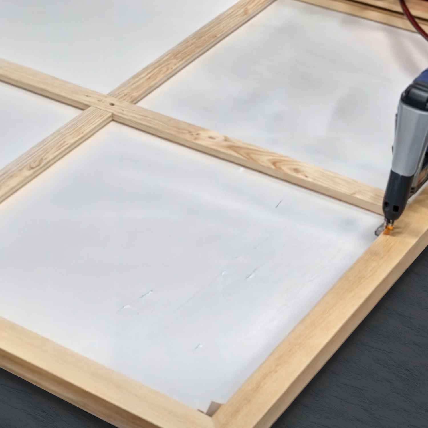 Hereafter my team in the print production is stretching the canvas print on wooden frame on the back.